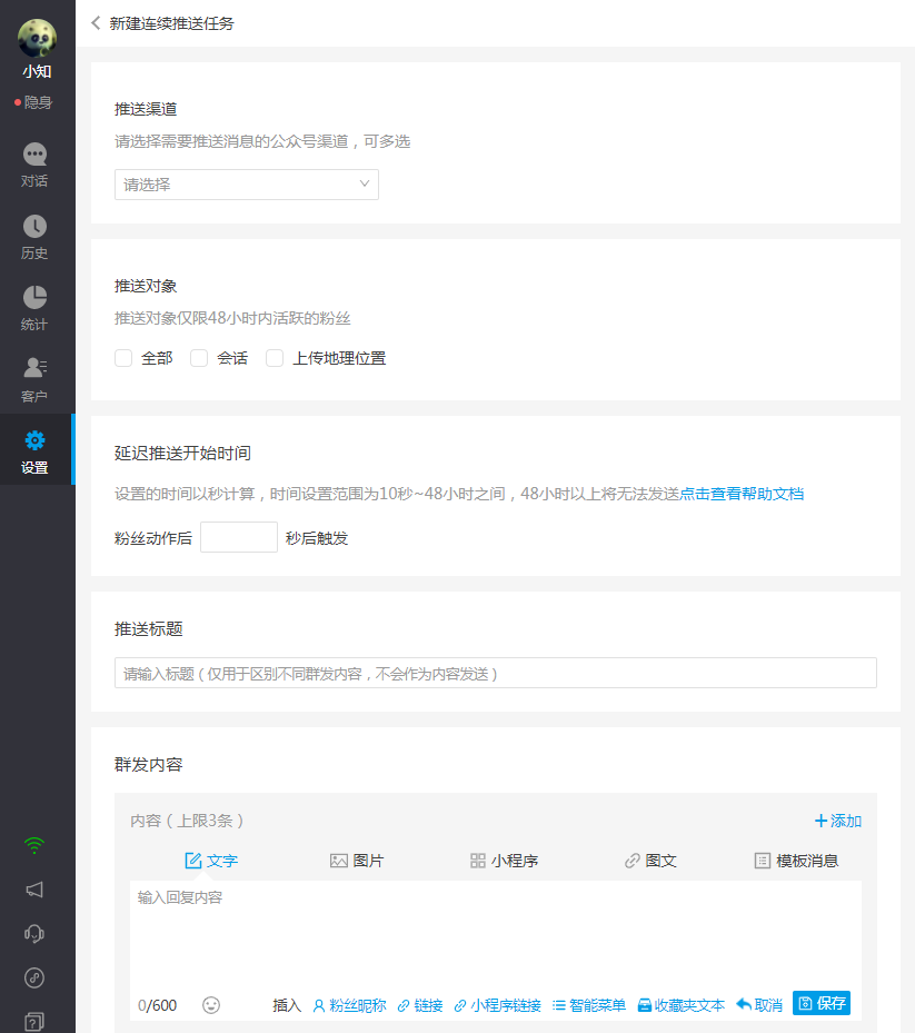可以设置推送时间,即动作产生后多少分钟对粉丝推送消息,可以推送多条。