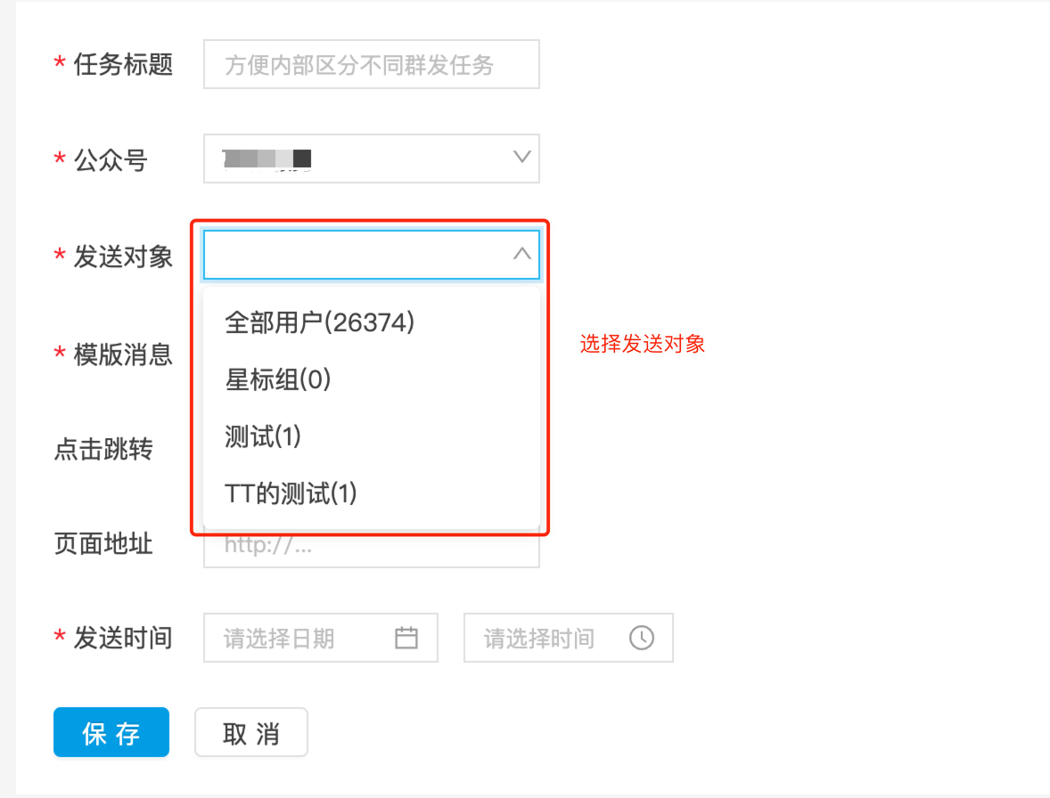 - 设置群发对象① 根据标签:指定标签,无标签② 根据条件:用户标签(选择和排除);